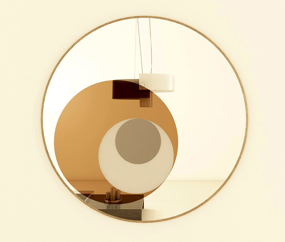 Measuring 950 mm in diametre, the mirror panel includes circles in tinted bronze, tinted grey, frosted and plane mirrors.