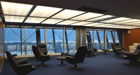 The combination of natural light from the glass windows and the soft illumination from the backlit ceiling panels creates a soothing indoor environment.