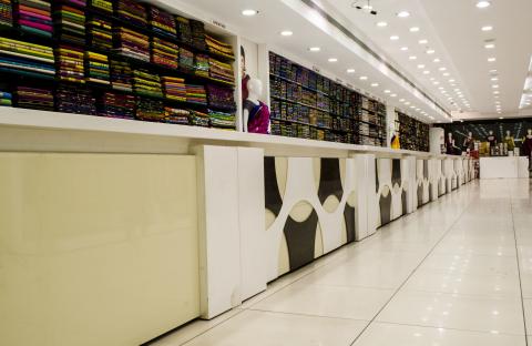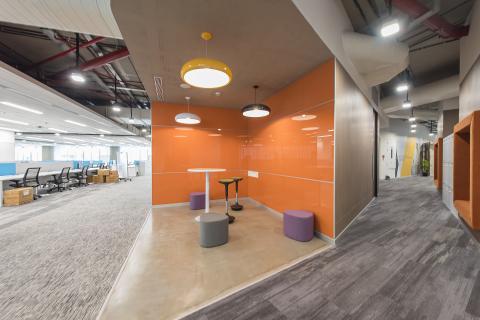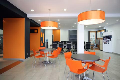 The colour scheme of the cafeteria includes hues of orange, grey, black and white which combine together to impart a dynamic look.