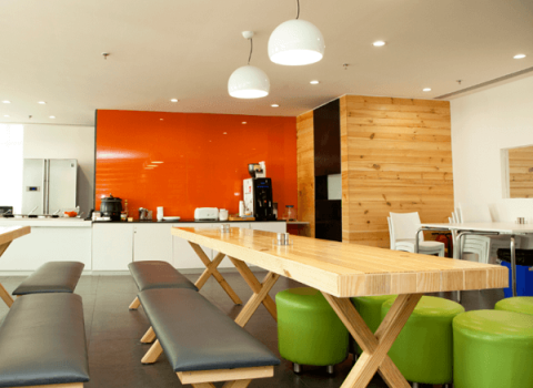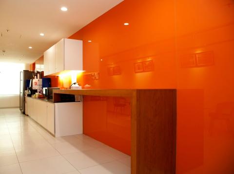 The bright orange lacquered glass Wall Paneling for office cafeteria looks elegant and durability.