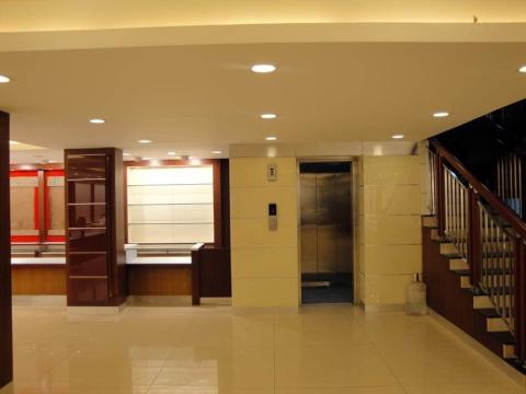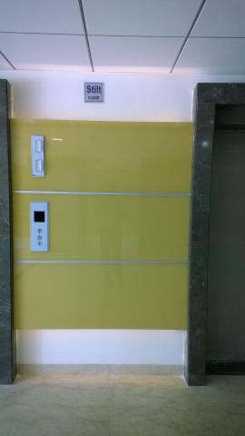 The lift facade incorporates off-white lacquered glass panels which looks luxurious and visually connects with the off-white vitrified tiles and false ceiling.