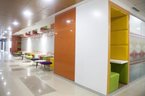 Vibrant, multicolored lacquered glass panels transform the office lounge into a playful and dynamic space. The dazzling array of colors creates a stimulating and inspiring atmosphere.