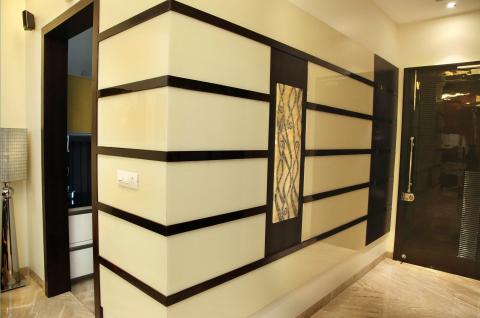 In this entrance foyer the off-white lacquered glass panels make a statement when combined with brown lacquered glass strips.