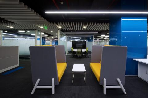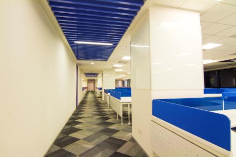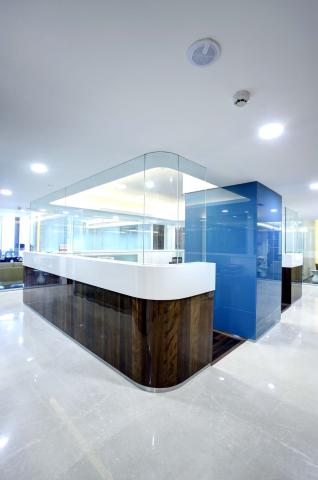 The blue lacquered glass panels offer privacy to each workstation and demarcate them from the circulation passage.
