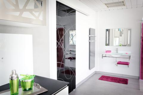 A decorative barn style door in black lacquered glass enhances the overall style quotient of this bathroom.