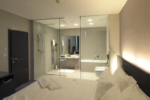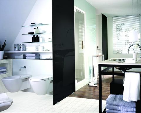 The white flooring tiles demarcate the bathroom from the rest of the space and the black lacquered glass partition forms a visual divider between the bidet and the water closet.