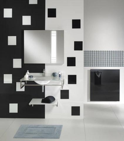The lacquered glass wall panelling behind the mirror-sink unit looks stunning with white squares on a black backdrop and white squares on a black backdrop.