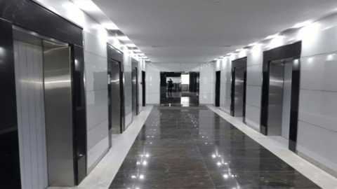 This lift lobby looks classic in hues of black and white while the reflective surface of the white lacquered glass panels infuse a luxurious vibe.
