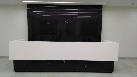 The black lacquered glass panels create an ultra modern reception area which stands out in shades of black and white.