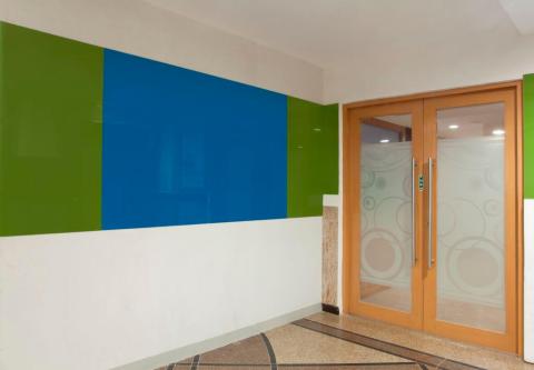 The olive green and blue lacquered glass wall paneling creates an eye-catching feature which breathes new life into a bare wall.